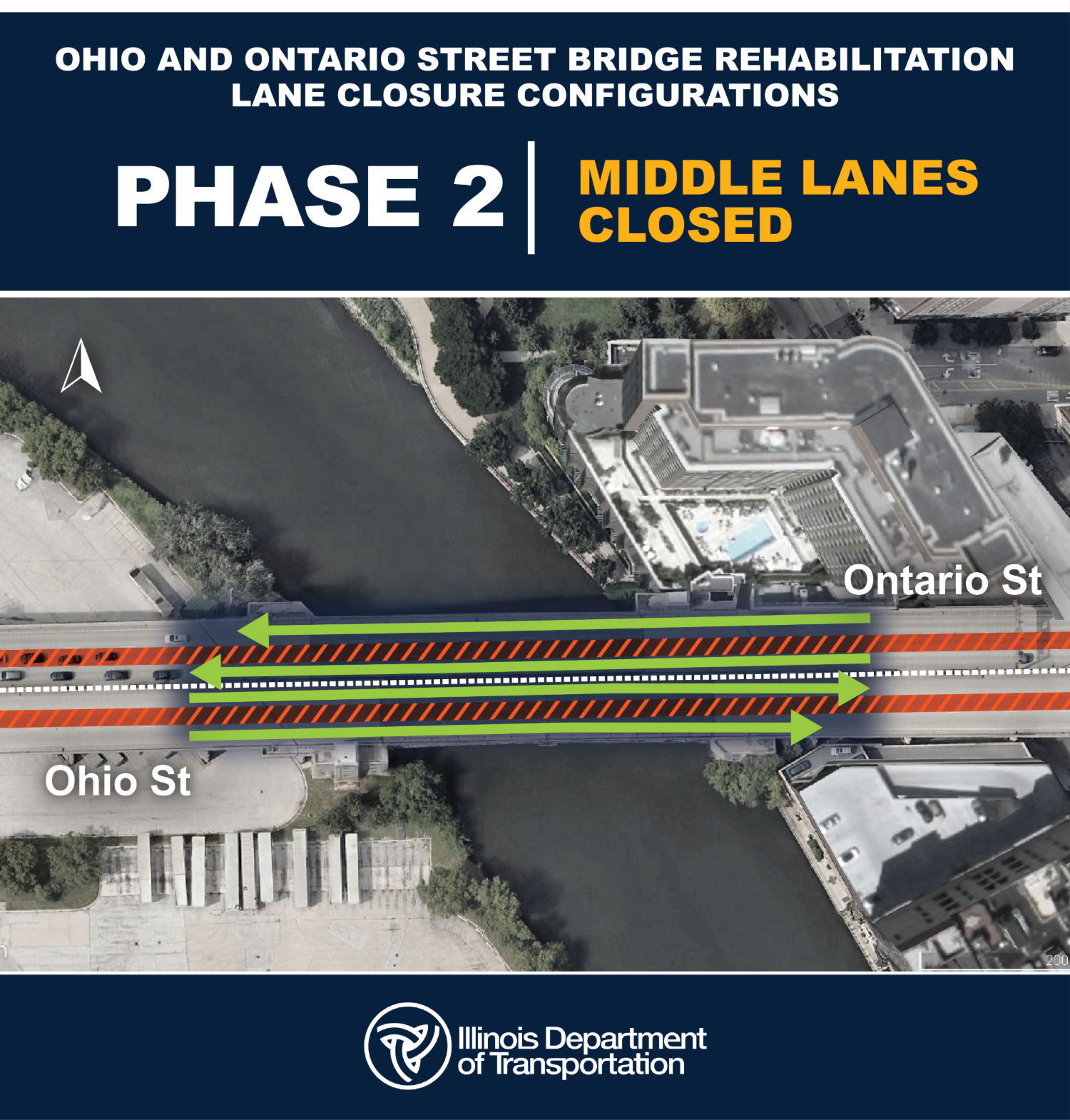 CHICAGO – The Illinois Department of Transportation announced today that as part of ongoing repairs to the bridges carrying Ohio and Ontario streets over the North Branch of the Chicago River, Union Pacific railroad and Kingsbury Street in Chicago, a stage change is scheduled to take place beginning, weather permitting, Tuesday, Oct. 14.