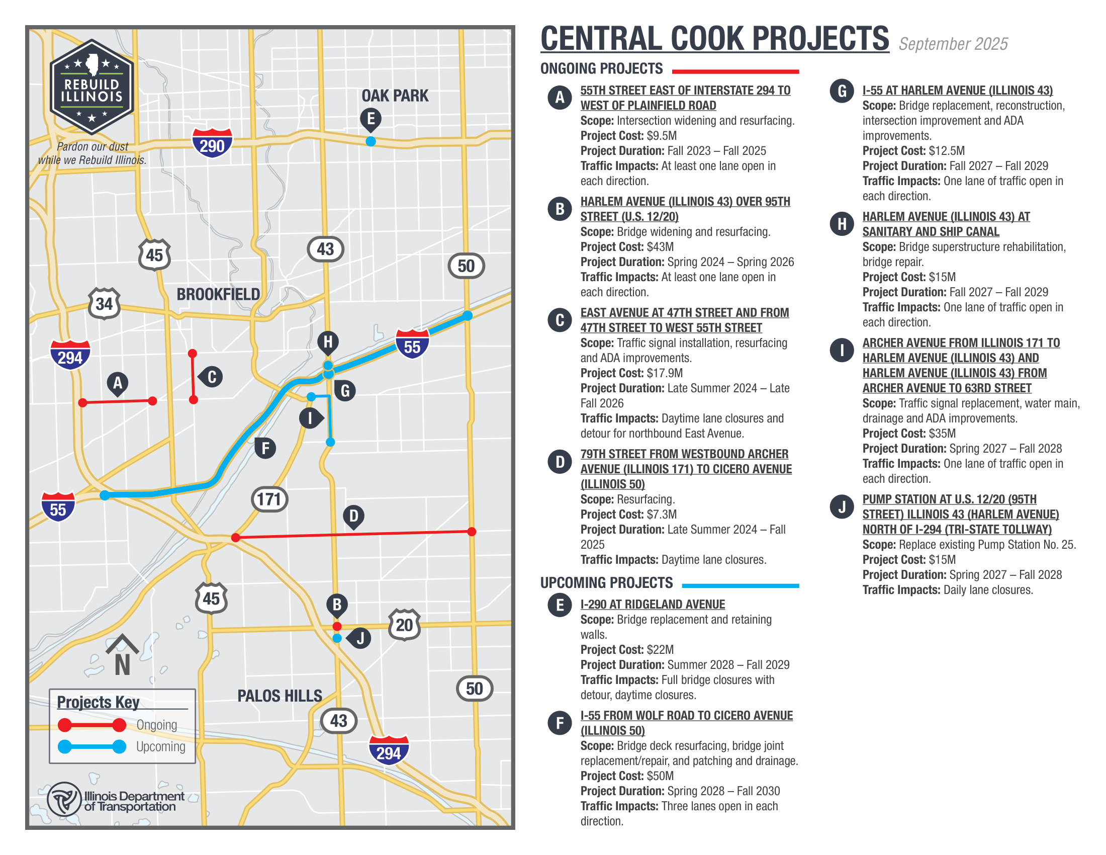 - 79th Street from westbound Archer Avenue (Illinois 171) to Cicero Avenue (Illinois 50) resurfacing began in 2024 and is anticipated to be completed this fall. Daytime lane closures are in place.